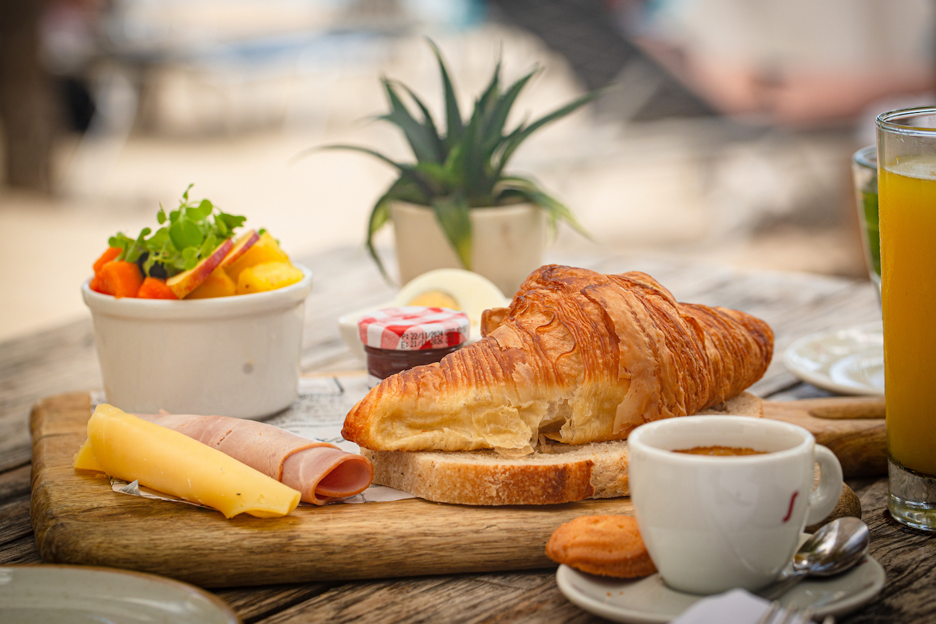 Start your day with your feet in the sand and a view of the sparkling bay. Enjoy a fresh coffee or juice with a buttery croissant, a fluffy omelet, or a granola bowl—the perfect island breakfast.
